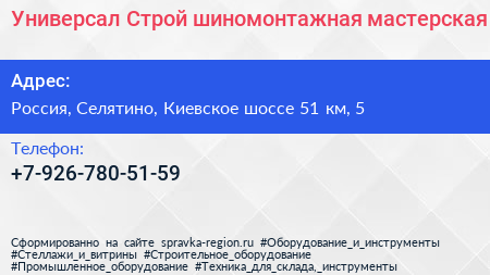Универсал-Строй, шиномонтажная мастерская по адресу Спецбатальон ДПС «Южный» (Алабино), Центральная кольцевая автомобильная дорога, Наро-Фоминский городской округ, Московская область, Центральный федеральный округ, 143345, Россия в дальнейшем Организация, размещена в следующих категориях: