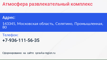Атмосфера, развлекательный комплекс по адресу 143345, Московская область, Селятино, Промышленная, 80 в дальнейшем Организация, размещена в следующих категориях:
