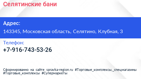 Селятинские бани по адресу 143345, Московская область, Селятино, Клубная, 3 в дальнейшем Организация, размещена в следующих категориях: