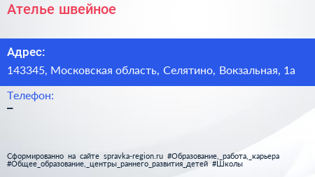 Ателье швейное по адресу 143345, Московская область, Селятино, Вокзальная, 1а в дальнейшем Организация, размещена в следующих категориях: