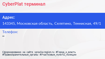 CyberPlat, терминал по адресу 143345, Московская область, Селятино, Теннисная, 49/1 в дальнейшем Организация, размещена в следующих категориях:
