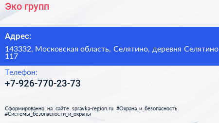 Эко-групп по адресу 143332, Московская область, Селятино, деревня Селятино, 117 в дальнейшем Организация, размещена в следующих категориях: