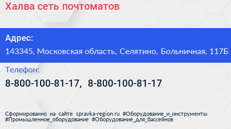 Халва, сеть почтоматов по адресу 143345, Московская область, Селятино, Больничная, 117Б в дальнейшем Организация, размещена в следующих категориях: