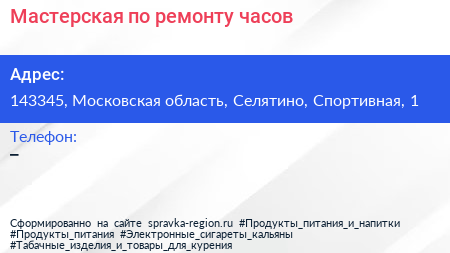 Мастерская по ремонту часов по адресу 143345, Московская область, Селятино, Спортивная, 1 в дальнейшем Организация, размещена в следующих категориях: