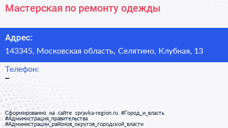 Мастерская по ремонту одежды по адресу 143345, Московская область, Селятино, Клубная, 13 в дальнейшем Организация, размещена в следующих категориях: