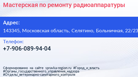 Мастерская по ремонту радиоаппаратуры по адресу 143345, Московская область, Селятино, Больничная, 22/23 в дальнейшем Организация, размещена в следующих категориях: