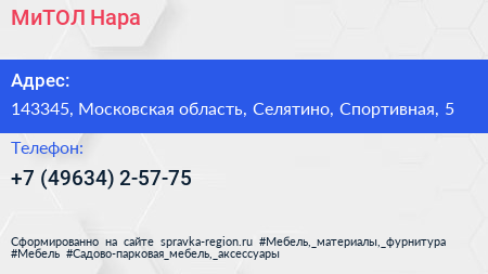МиТОЛ-Нара по адресу 143345, Московская область, Селятино, Спортивная, 5 в дальнейшем Организация, размещена в следующих категориях: