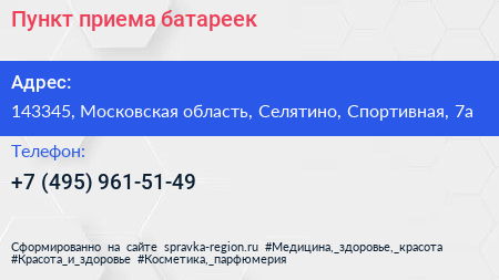 Пункт приема батареек по адресу 143345, Московская область, Селятино, Спортивная, 7а в дальнейшем Организация, размещена в следующих категориях: