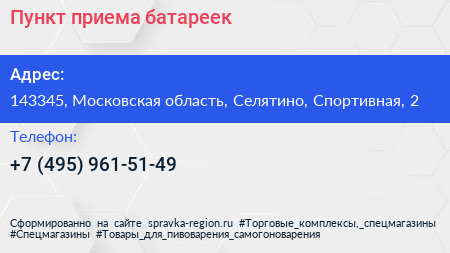 Пункт приема батареек по адресу 143345, Московская область, Селятино, Спортивная, 2 в дальнейшем Организация, размещена в следующих категориях: