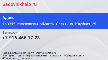 Sadovnikhelp.ru по адресу 143345, Московская область, Селятино, Клубная, 29 в дальнейшем Организация, размещена в следующих категориях: