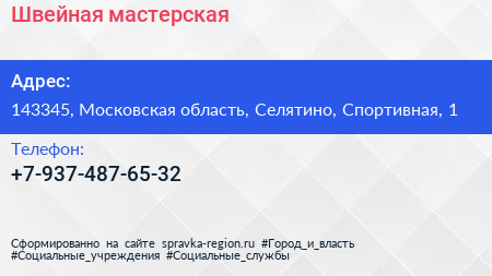 Швейная мастерская по адресу 143345, Московская область, Селятино, Спортивная, 1 в дальнейшем Организация, размещена в следующих категориях: