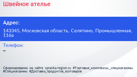 Швейное ателье по адресу 143345, Московская область, Селятино, Промышленная, 116а в дальнейшем Организация, размещена в следующих категориях: