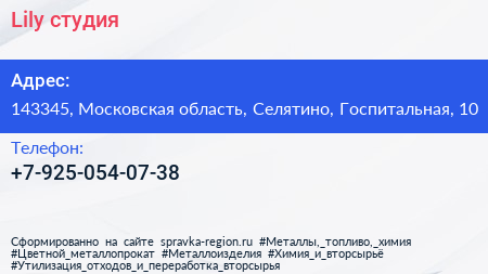 Lily, студия по адресу 143345, Московская область, Селятино, Госпитальная, 10 в дальнейшем Организация, размещена в следующих категориях: