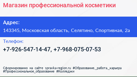Магазин профессиональной косметики по адресу 143345, Московская область, Селятино, Спортивная, 2а в дальнейшем Организация, размещена в следующих категориях: