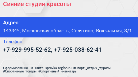 Сияние, студия красоты по адресу 143345, Московская область, Селятино, Вокзальная, 3/1 в дальнейшем Организация, размещена в следующих категориях:
