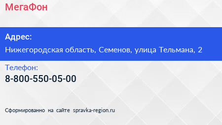 МегаФон по адресу Нижегородская область, Семенов, улица Тельмана, 2 в дальнейшем Организация, размещена в следующих категориях: