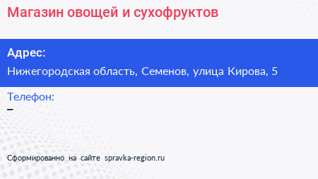 Магазин овощей и сухофруктов по адресу Нижегородская область, Семенов, улица Кирова, 5 в дальнейшем Организация, размещена в следующих категориях:
