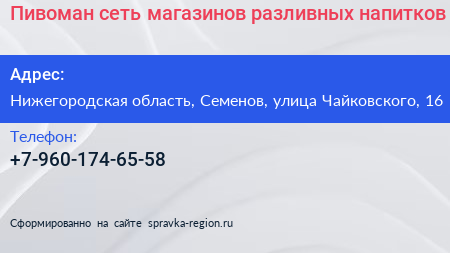 Пивоман, сеть магазинов разливных напитков по адресу Нижегородская область, Семенов, улица Чайковского, 16 в дальнейшем Организация, размещена в следующих категориях: