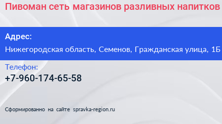 Пивоман, сеть магазинов разливных напитков по адресу Нижегородская область, Семенов, Гражданская улица, 1Б в дальнейшем Организация, размещена в следующих категориях: