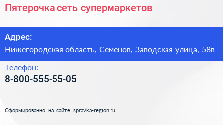 Пятерочка, сеть супермаркетов по адресу Нижегородская область, Семенов, Заводская улица, 58в в дальнейшем Организация, размещена в следующих категориях:
