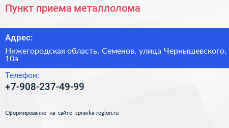 Пункт приема металлолома по адресу Нижегородская область, Семенов, улица Чернышевского, 10а в дальнейшем Организация, размещена в следующих категориях: