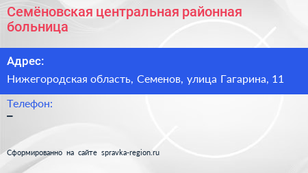 Семёновская центральная районная больница по адресу Нижегородская область, Семенов, улица Гагарина, 11 в дальнейшем Организация, размещена в следующих категориях: