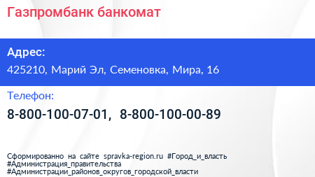 Газпромбанк, банкомат по адресу 425210, Марий Эл, Семеновка, Мира, 16 в дальнейшем Организация, размещена в следующих категориях: