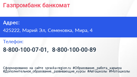 Газпромбанк, банкомат по адресу 425222, Марий Эл, Семеновка, Мира, 4 в дальнейшем Организация, размещена в следующих категориях: