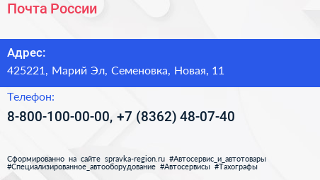 Почта России по адресу 425221, Марий Эл, Семеновка, Новая, 11 в дальнейшем Организация, размещена в следующих категориях:
