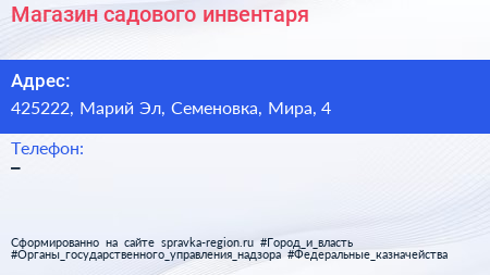Магазин садового инвентаря по адресу 425222, Марий Эл, Семеновка, Мира, 4 в дальнейшем Организация, размещена в следующих категориях: