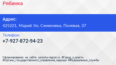 Рябинка по адресу 425221, Марий Эл, Семеновка, Полевая, 37 в дальнейшем Организация, размещена в следующих категориях: