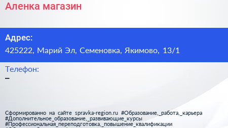 Аленка, магазин по адресу 425222, Марий Эл, Семеновка, Якимово, 13/1 в дальнейшем Организация, размещена в следующих категориях: