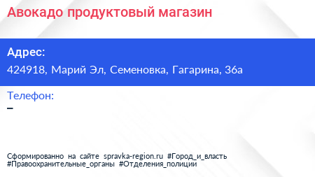 Авокадо, продуктовый магазин по адресу 424918, Марий Эл, Семеновка, Гагарина, 36а в дальнейшем Организация, размещена в следующих категориях: