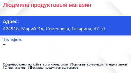 Людмила, продуктовый магазин по адресу 424918, Марий Эл, Семеновка, Гагарина, 47 к1 в дальнейшем Организация, размещена в следующих категориях: