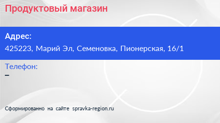 Продуктовый магазин по адресу 425223, Марий Эл, Семеновка, Пионерская, 16/1 в дальнейшем Организация, размещена в следующих категориях: