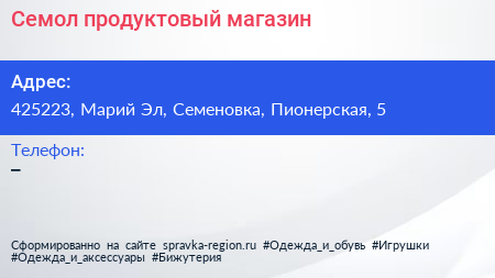 Семол, продуктовый магазин по адресу 425223, Марий Эл, Семеновка, Пионерская, 5 в дальнейшем Организация, размещена в следующих категориях: