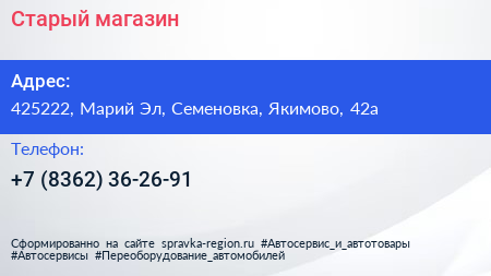 Старый магазин по адресу 425222, Марий Эл, Семеновка, Якимово, 42а в дальнейшем Организация, размещена в следующих категориях: