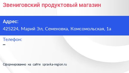 Звениговский, продуктовый магазин по адресу 425224, Марий Эл, Семеновка, Комсомольская, 1а в дальнейшем Организация, размещена в следующих категориях: