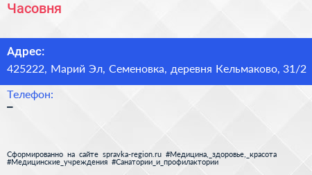 Часовня по адресу 425222, Марий Эл, Семеновка, деревня Кельмаково, 31/2 в дальнейшем Организация, размещена в следующих категориях: