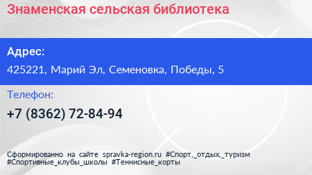 Знаменская сельская библиотека по адресу 425221, Марий Эл, Семеновка, Победы, 5 в дальнейшем Организация, размещена в следующих категориях:
