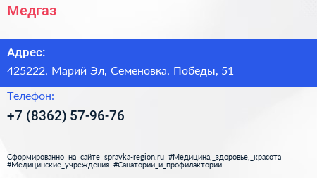 Медгаз по адресу 425222, Марий Эл, Семеновка, Победы, 51 в дальнейшем Организация, размещена в следующих категориях: