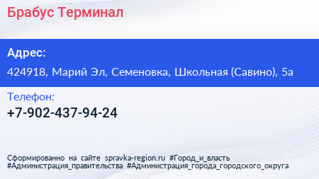 Брабус, Терминал по адресу 424918, Марий Эл, Семеновка, Школьная (Савино), 5а в дальнейшем Организация, размещена в следующих категориях: