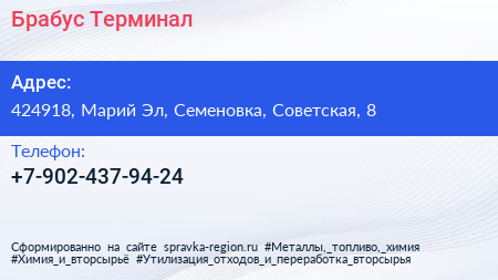 Брабус, Терминал по адресу 424918, Марий Эл, Семеновка, Советская, 8 в дальнейшем Организация, размещена в следующих категориях: