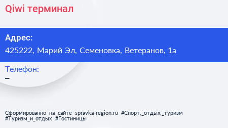 Qiwi, терминал по адресу 425222, Марий Эл, Семеновка, Ветеранов, 1а в дальнейшем Организация, размещена в следующих категориях: