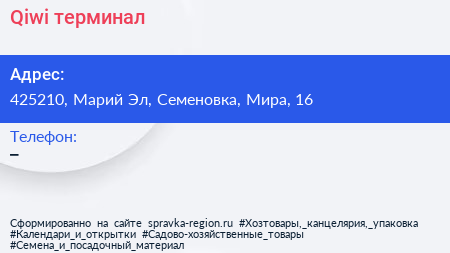 Qiwi, терминал по адресу 425210, Марий Эл, Семеновка, Мира, 16 в дальнейшем Организация, размещена в следующих категориях:
