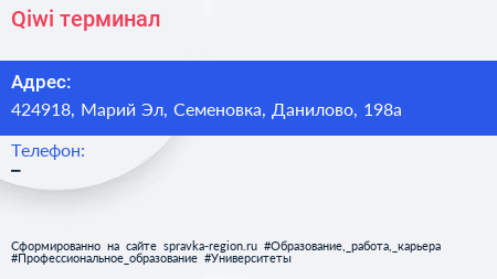 Qiwi, терминал по адресу 424918, Марий Эл, Семеновка, Данилово, 198а в дальнейшем Организация, размещена в следующих категориях: