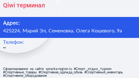 Qiwi, терминал по адресу 425224, Марий Эл, Семеновка, Олега Кошевого, 9а в дальнейшем Организация, размещена в следующих категориях: