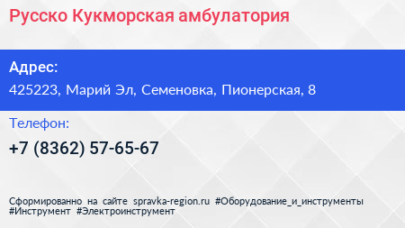 Русско-Кукморская амбулатория по адресу 425223, Марий Эл, Семеновка, Пионерская, 8 в дальнейшем Организация, размещена в следующих категориях: