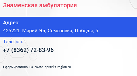 Знаменская амбулатория по адресу 425221, Марий Эл, Семеновка, Победы, 5 в дальнейшем Организация, размещена в следующих категориях: