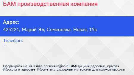 БАМ, производственная компания по адресу 425221, Марий Эл, Семеновка, Новая, 15в в дальнейшем Организация, размещена в следующих категориях:
